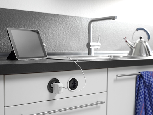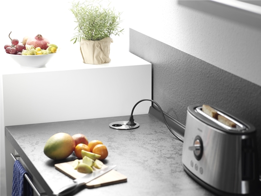 De ronde TWIST is met een inbouwdiepte van slechts 40 mm en compact design in bijna iedere omgeving - zelfs boven een keukenlade - inzetbaar. Met een simpele draaibeweging verschijnen of verdwijnen de aansluitpunten.
