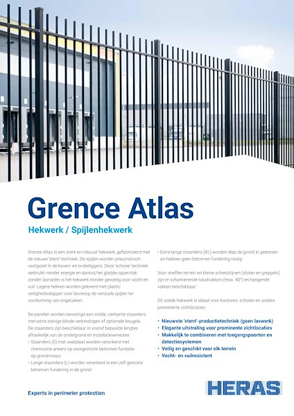 Grence Atlas is een sterk en robuust hekwerk, gefabriceerd met de nieuwe ‘stent’-techniek. Hierbij wordt perslucht in de ronde, verticale spijlen geblazen om ze stevig vast te zetten in de boven- en onderliggers. Deze ‘schone’ techniek verbruikt minder energie en dankzij het gladde oppervlak zonder lasnaden is het hekwerk minder gevoelig voor vocht en vuil. Lagere hekken worden geleverd met plastic veiligheidsdoppen voor bovenop de verticale spijlen ter voorkoming van ongelukken.