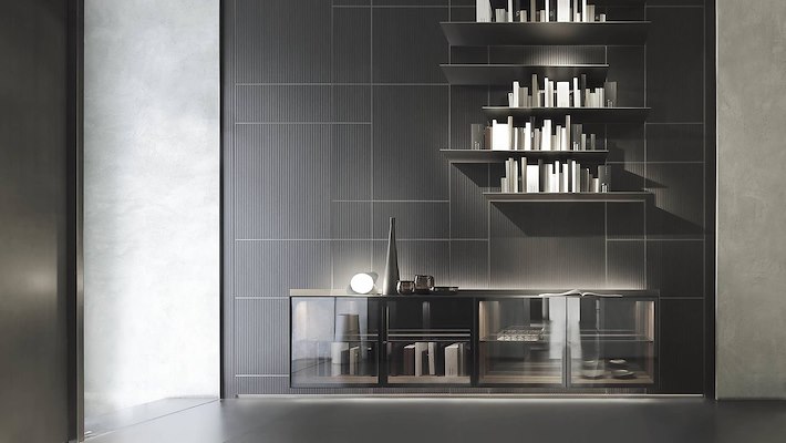 modulaire textiel panelen met Self Bold zwevend dressoir van Rimadesio