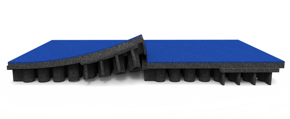 tegels zijn ontworpen om de bestaande vloer te beschermen en de voortplanting van geluid/trillingen te reduceren. De unieke holle noppen aan de onderzijde van de tegels zijn flexibel en zorgen voor de demping wanneer halters, dumbells of andere gewichten op de vloer terecht komen.