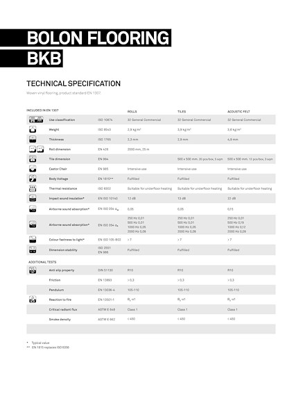 BKB is verkrijgbaar in acht verschillende kleuren en kleurcombinaties. Alle kleuren zijn te bestellen als rollen van 200 cm breed of als tegels van 50x50 cm. De volledige collectie is ook toe te passen als geometrische Bolon Studio tile.