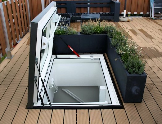 De daktoetreding kan bij 24 graden geopend worden om te ventileren en bij 48 en 87 graden om het dak te betreden. Deze Intura daktoetreding bevat een veiligheidsfunctie waardoor deze niet zomaar sluit bij harde wind.