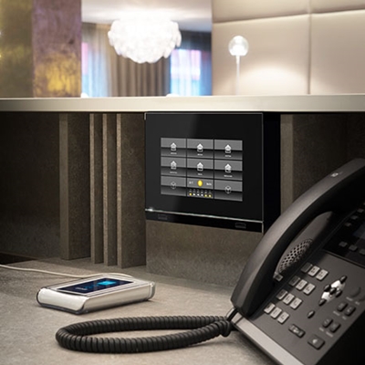 In het frontline office kan één van de JUNG Smart Controls door het receptiepersoneel gebruikt worden voor optimale service aan de gasten. Direct bij het inchecken kunnen van tevoren ingestelde profielen worden geactiveerd. De wensen van de gast zijn voor het personeel zichtbaar op de monitor.