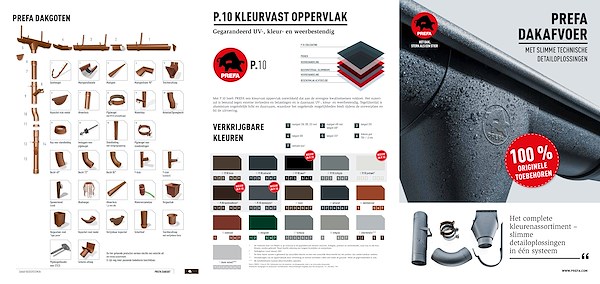 Het systeem is verkrijgbaar in de klassieke standaardkleuren die bij de dak- en gevelelementen passen. U kunt hierdoor kiezen voor elegante oplossingen met bij elkaar passende kleuren of juist bewust kleuraccenten toevoegen. Vanaf 2019 zijn de kleuren antraciet, bruin en lichtgrijs ook in P.10 kwaliteit verkrijgbaar. Met P.10 heeft PREFA een kleurvast oppervlak ontwikkeld dat aan de strengste kwaliteitseisen voldoet. Het materiaal is bestand tegen externe invloeden en belastingen en is daarnaast gegarandeerd UV-, kleur- en weerbestendig. Meer informatie op pagina 94 van onze folder "DE ALUMINIUM TOTAALSYSTEMEN VAN PREFA 2020".