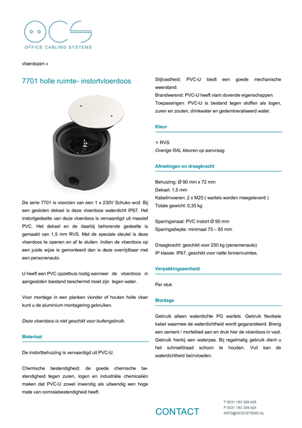 De 7700 serie beschikt over een afsluitbaar deksel. Wel zo veilig wanneer de vloerdoos niet gebruikt wordt. Daarnaast kan deze vloerdoos zonder probleem worden meegenomen in een goede schrobbeurt. Hij is namelijk water dicht. De behuizing is gemaakt van een zware kwaliteit PVC-U (zonder weekmakers) en is daarom goed bestand tegen zuren en logen.