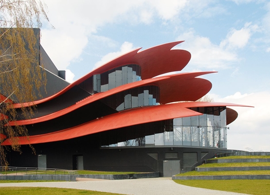 Het architectonische meesterwerk in Potsdam vlak bij Berlijn, het Hans Otto Theater, kenmerkt zich door zijn drie vuurrode, boven elkaar gelegen, gewelfde schaalvormige dakdelen. Het gebouw, dat is vernoemd naar de Duitse acteur Hans Otto, is volledig geïntegreerd in de bestaande structuur van de voormalige kazerne Schiffbauergasse. De uitgesproken kleur vormt het verbindende element tussen de relatief eenvoudige oudbouw en expressieve nieuwbouw.