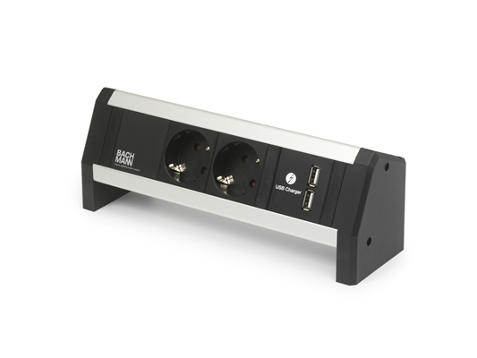 opbouwstopcontact met twee stopcontacten en twee USB-chargers om een laptop of mobiel met alleen een kabeltje op te laden. Slepen met stekkers is niet meer nodig.