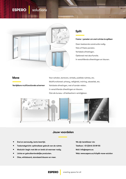 De eenvoudige en snelle bediening van deze ruimtebesparende wanden, de zeer korte levertijd, het schoonmaakgemak en de verschillende afwerkingen, maken dit dé oplossing voor het flexibel in delen van jouw kantoor, school, winkel, restaurant of onderneming.