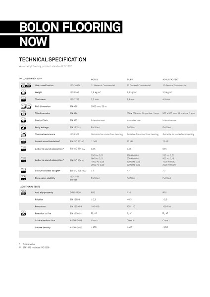 Now is verkrijgbaar in 6 kleurcombinaties, zowel in rollen van 200 cm breed als in tegels van 50x50 cm. De collectie is ook te bestellen met de extra acoustische ISI-backing van Bolon.Net als alle andere producten van Bolon is Now ijzersterk, volledig projectgeschikt en gemakkelijk te onderhouden.