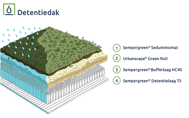 Het Detentiedak wordt opgebouwd uit vier unieke lagen. Elke zorgvuldig geselecteerde laag in de opbouw draagt bij aan het vertraagd afvoeren van regenwater. Tegelijkertijd creëren deze vier lagen uitstekende groeicondities voor de bovenliggende Sedumvegetatie. Deze innovatie gaat een stap verder dan een regulier (groen)dak, doordat het Detentiedak ook in verzadigde toestand en dus onder extreme weersomstandigheden in staat blijft om het regenwater volledig te bufferen en gecontroleerd af te voeren. Deze unieke eigenschap is van belang tijdens piekregens en meerdaagse stormen. Het verzadigd gewicht van het Detentiedak is circa 90 kg/m