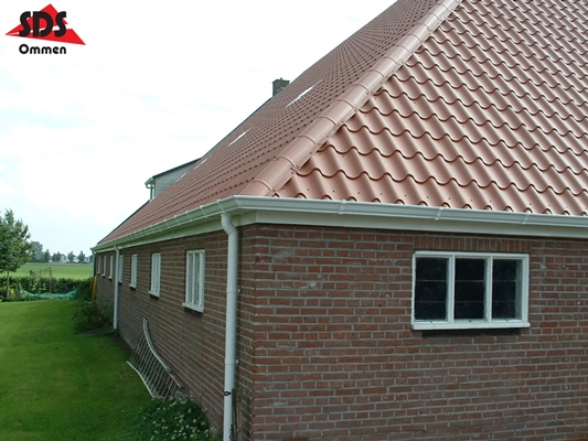 Je kunt de gewenste aluminium hemelwaterafvoer in dezelfde kleur krijgen als de bijpassende naadloze aluminium dakgoten. Hierdoor creëer je een samenhangend of juist sprekend systeem voor de gevel.