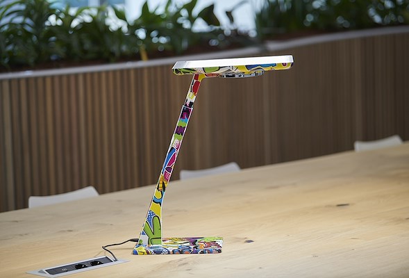Eerste tafelarmatuur die door een directe en indirecte lichtcomponent?tegelijk de ruimte en het bureauperfect verlicht