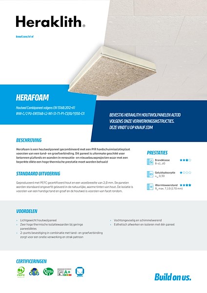 De Heraklith Herafoam combineert een houtwolplaat met een hardschuim PIR isolatieplaat. Deze houtwolplaat is de perfecte keuze voor de afwerking van betonnen plafonds en wanden in renovatie- en nieuwbouwprojecten waar u met een beperkte dikte een hoge thermische prestatie moet realiseren.