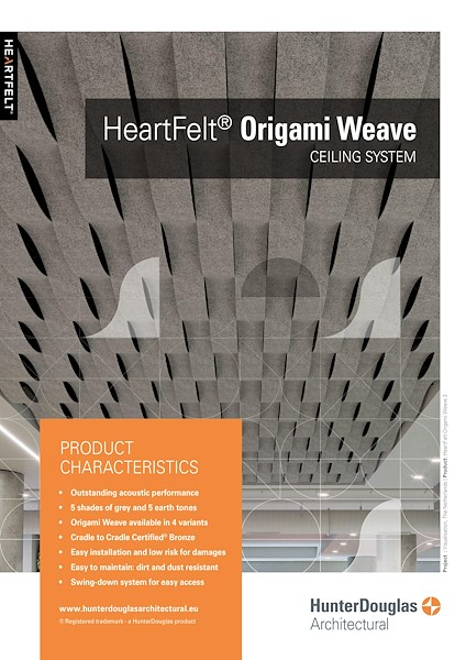 HeartFelt® Origami is een uitbreiding op de reeds bestaande vilten plafondsystemen in de HeartFelt®-collectie. Met dit nieuwe ontwerp introduceert Hunter Douglas Architectural een plafondsysteem waarvan de vorm en verstijving gebaseerd zijn op de origami-vouwtechniek. Dit maakt dat de vilten panelen extra stijfheid en zeer gunstige akoestische eigenschappen krijgen. Deze wijze van vouwen resulteert in een bijzonder fraaie afwerking, maar zorgt tegelijk voor veelgeluid demping. Bij de ontwikkeling van dit plafond, is de oosterse vouwtechniek uitgebreid bestudeerd. Origami is namelijk een zeer praktische methode om materiaal stijf te krijgen, zonder dat je andere materialen of producten hoeft toe te voegen. Daardoor kan dit systeem een prominente rol spelen bij de wensen van de architect en kan men streven naar circulair en duurzaam bouwen. Tegelijk levert de uiteindelijke vorm, een speels veld van driehoeken, een sterke geluiddempende prestatie.