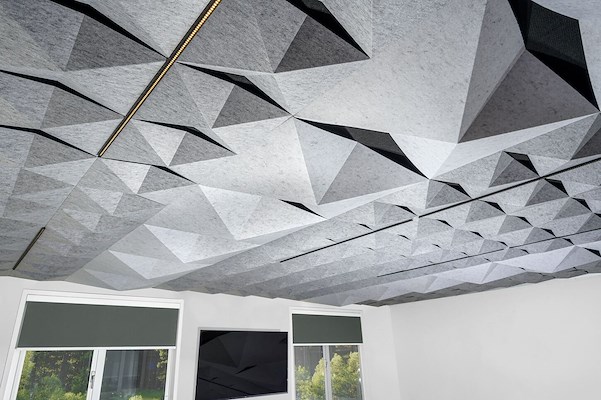 Dit nieuwe vilten plafondsysteem van Hunter Douglas Architectural zorgt niet alleen esthetisch voor een uniek uiterlijk, maar levert ook hoge akoestische prestaties. De combinatie van het materiaal - vilt in vijf tinten grijs - en de vorm: origami gevouwen panelen - geeft elke ruimte een zeer opvallende uitstraling.