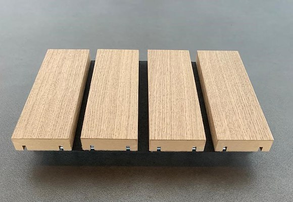 Lineair houtfineer is uitvoerbaar in een aantal standaard maatvoeringen, een breed assortiment fineeruitstralingen en een massief houten of mdf kern. Het biedt een prachtig en prijsvriendelijk alternatief voor de toepassing van luxe en kostbare houtsoorten. De voegen in het systeem zijn voorzien van een akoestisch vezelvlies. U heeft de keuze uit de standaard kleuren zwart, wit of grijs. De houtfineer delen worden altijd afgewerkt met een hoogwaardige lak. De lengtes van de delen zijn een mix van maatvoeringen (minimaal vanaf 900 mm). Dit is mede afhankelijk van de beschikbare grondstof van de kern. De kopse kanten zijn voorzien van een uitgefreesde mes en groefverbinding. Dit garandeert dat de uiteinden mooi aansluiten en een eenvoudige koppeling. Het Derako