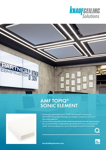 Het frameloze plafondeiland AMF TOPIQ® Sonic element is voorzien van AMF TOPIQ® Strong Edge Technology. De zichtzijde en randen zijn met vlies en kleurcoating afgewerkt.