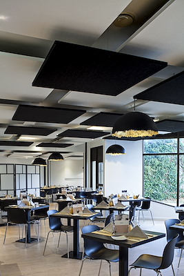 AMF THERMATEX® Sonic Modern is een plafondeiland met een aluminium frame. Door de flexibele ophanging met fijne staalkabels kan de hoogte individueel naar wens worden aangepast.