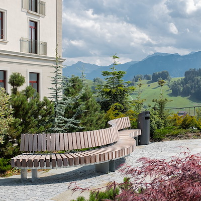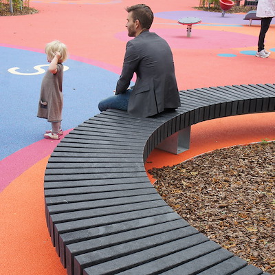 zijn gebogen banken met een sterk karakter. De dwars geplaatste balkelementen zijn gepositioneerd in een zelfdragende kam. De modules van 200 cm zijn eindeloos te koppelen. Optioneel kan de bank gecompleteerd worden met arm- en/of rugleuningen. De bijbehorende rug is bol geschaafd en kan vrijwel op elke gewenste plek bevestigd worden. De zittingsbalken zijn naast hout verkrijgbaar in het kunststof recyclaat All Black. Door de oriëntatie van de balken is de bank van nature anti-skate!
