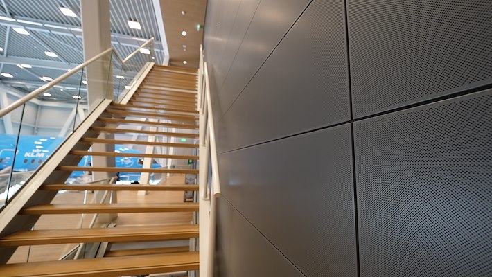 Met metalen plafonds op maat kunt u eenvoudig een monolithische look creëren met extra brede metalen panelen of een sterreneffect met trapeziumvormige panelen, precies afgestemd op uw ruimte. Of het nu gesegmenteerd, vlak of gebogen is: met op maat gemaakte oplossingen, individuele maten, vormen, afwerkingen en perforaties, kan uw volgende project extra speciaal worden.