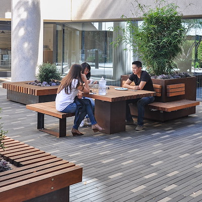 De verschillende elementen zijn vervaardigd uit thermisch verzinkt, CorTen of gepoedercoat staal met FSC-hardhouten, Cloudy Grey of Accoya Solid latten (7x7 cm).