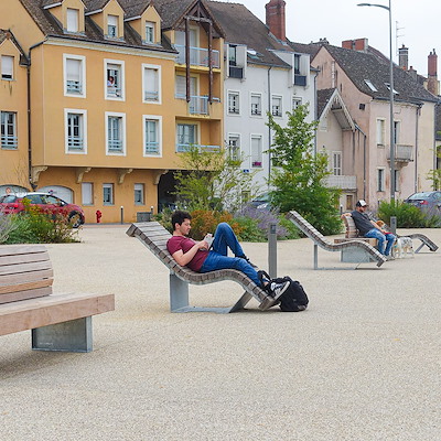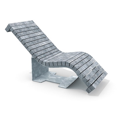 heeft een uitnodigende vloeiende vorm. Het is een luie bank waarop het heerlijk vertoeven is in de zon. Het gekromde zitvlak bestaat uit 70 of 120 cm lange Solid balken (7x7 cm). Het hoofd- en voeteneinde worden beëindigd met een robuuste Rough&Ready balk (7x15 cm); vandaar Solid Serif. Het Chaise Longue zitvlak zweeft boven het gras. Het stalen onderstel is uitgevoerd in thermisch verzinkt staal, CorTen of RAL-kleur poedercoat en moet verankerd worden.