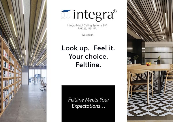 Met het Feltline™ vilt plafondsysteem van Integra creëer je gebouwruimtes met een luxe en warme uitstraling. Door het gebruik van maar liefst 70% gerecyclede materialen is het plafondsysteem zeer duurzaam. Daarnaast zorgt het natuurlijke materiaal ervoor dat de akoestiek in de onderliggende ruimte sterk wordt verbeterd.