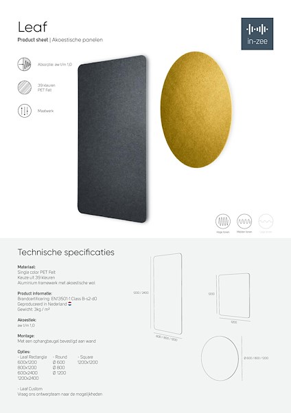 Het akoestisch wandpaneel Leaf hangt met een ophangbeugel aan de wand. Wij maken de akoestische eilanden rond, rechthoekig of als maatwerk in organische vormen. De panelen zijn gemaakt van PET Felt, een duurzaam materiaal van gerecyclede plastic flessen. Een aluminium frame zorgt voor een stijve constructie en een extra laag akoestische wol zorgt voor een totale absorptiewaarde van aw=1,0