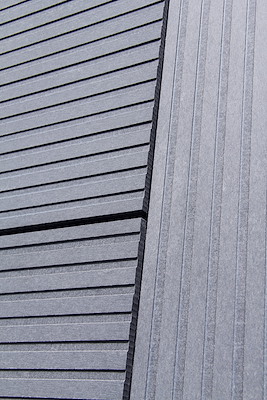 Gevelplaat in vezelcement met gekleurde kern en gefreesde lijnen over de lengte van de plaat.