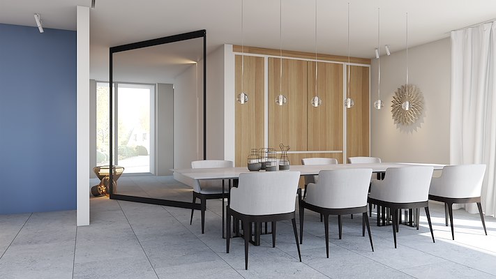 Onze minimalistische aluminium profielen in combinatie met glas zorgen voor transparantie en een optimale lichtinval waarmee je een heerlijk ruimtelijk effect creëert.