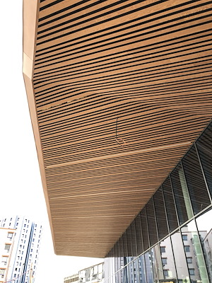 Een uniek massief houten plafond creëert u met Lineair projectoplossing van Hunter Douglas Architectural. Net als de BaseLine en ProLine combineert dit systeem massief houten delen met het praktische Derako
