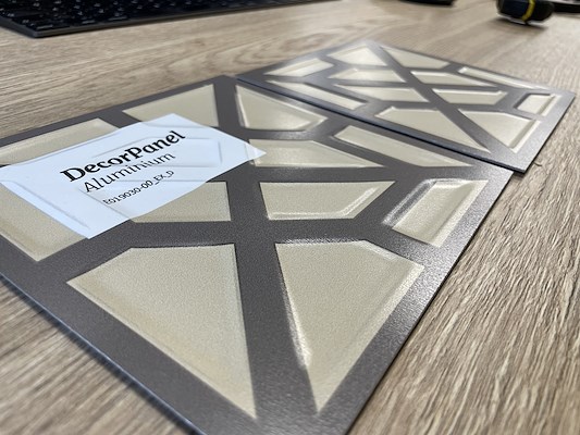 DecorPanel aluminium kan naast geperforeerd ook geëmbost worden. De plaat wordt dan eerst geprint en vervolgens door de embossing machine gehaald.