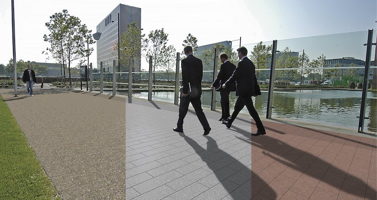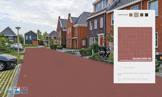 Na het selecteren van een kleur, patroon en legverband krijgt de ontwerper een preview te zien, waarbij een keuze gemaakt kan worden uit drie verschillende omgevingen: een marktplein, een woonwijk en een kantorenpark. Deze previews zijn gebaseerd op echte foto’s, rekening houdend met de lichtinval op de bestrating. Op deze manier kan de gebruiker meteen al een goed beeld krijgen van de gekozen bestrating in een bepaalde situatie.