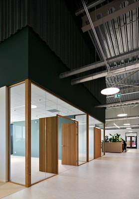 Systeemwanden met akoestische prestaties vormen een essentieel onderdeel van het interieurconcept. Door deze te combineren met houten profielen ontstaat een hoogwaardige, natuurlijke uitstraling die warmte toevoegt aan het ontwerp. Het gebruik van hout biedt ook een duurzame keuze binnen circulaire bouwprincipes — demontabel en eenvoudig te hergebruiken.
