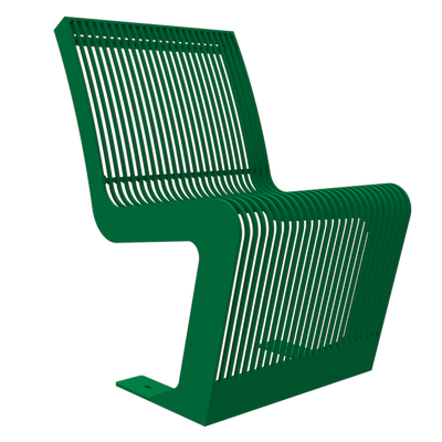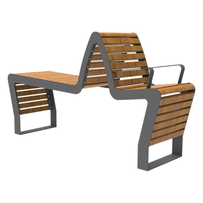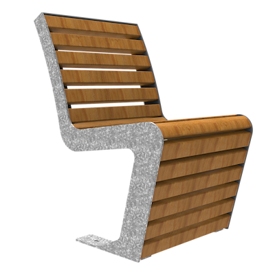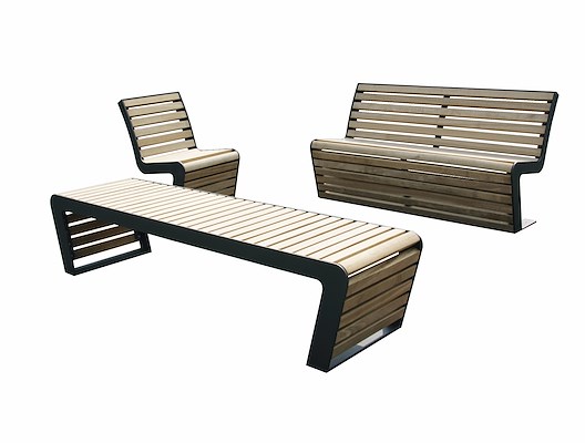 De stoel, bank en de afvalbak uit deze serie wordt gekenmerkt door de FSC®-gecertificeerde hardhouten delen die ingeklemd worden door de stripstalen.