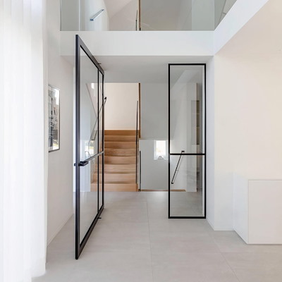 Deze imposante steel look taatsdeuren kunnen technisch gezien zonder kozijn geplaatst worden aangezien de scharniertechniek volledig onzichtbaar in het deurpaneel ingebouwd zit. In dergelijke opstelling worden de taatsscharnieren lokaal bovenop de volledig afgewerkte vloer en het plafond verankerd.