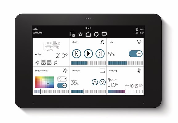 Het Smart Panel geeft mededelingen over belangrijke gebeurtenissen, zoals een geopend venster, of over het bedienen van de functies. De app is geoptimaliseerd voor mobiele apparaten (staand). Max. tien appgebruikers kunnen voor de toegang tot WLAN in het Smart Panel 8 worden vastgelegd en kunnen dan verlichting, zonwering, verwarming, muziek en nog veel meer bedienen.