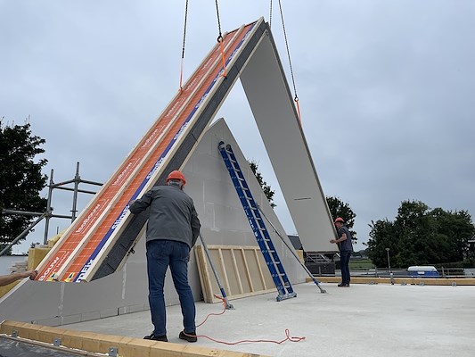 Max prefab dakelementen overbruggen het grote verschil tussen standaard dakelementen en volledig geprefabriceerde traditionele prefabsegmenten. De scharnierende SlimFix
