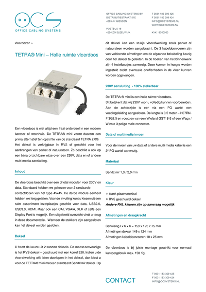 MINI is leverbaar met een vlak rvs-deksel en een deksel voor een eigen vloerafwerking, zoals parket of natuursteen. De drie kabeldoorvoeren in het deksel zijn voldoende om de afgaande bekabeling keurig in de vloerdoos te geleiden. Op de hoeken van het binnenwerk bevinden zich 4 stelboutjes. Deze kunnen in hoogte worden afgesteld, zodat de vloerdoos altijd waterpas ligt met de vloer.