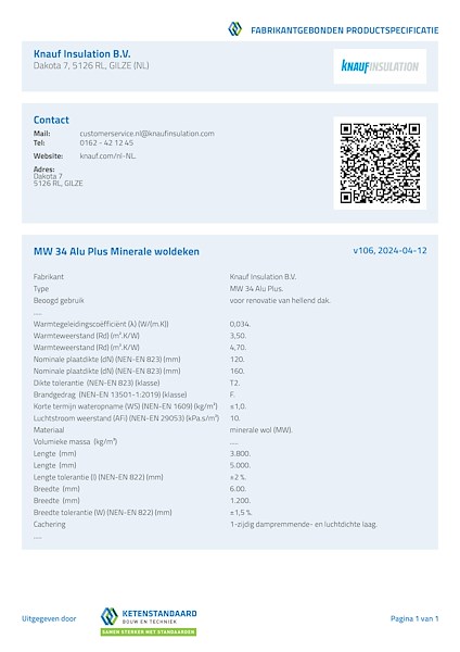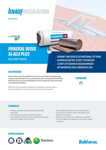 Dakisolatie MW 34 Alu Plus heeft een sterke, geintegreerde dampremmende bekleding. Met deze dakisolatie isoleer je snel en eenvoudig een gordingkap. De minerale wol heeft een brandklasse A1. De PET-PE folie F. Afwerking met gipsplaten zorgt voor de vereiste brandwering.