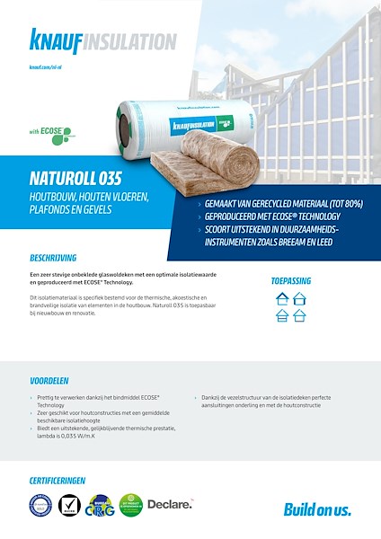Naturoll 035 glaswoldekens zijn zeer geschikt voor houtconstructies met een gemiddeld beschikbaar isolatiehoogte. De isolatie is heel veerkrachtig en sluit goed aan. Naturoll heeft een Euro brandklasse A1 en is dus onbrandbaar. De isolatie is geurloos en stofarm en werkt daarom zeer prettig in de industriele houtbouw.