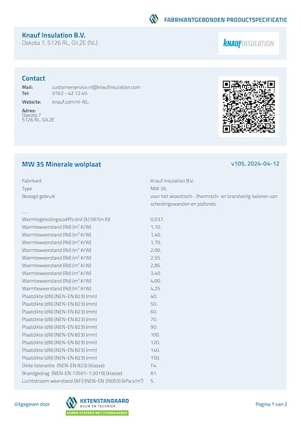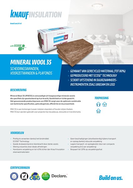 MW 35 is een zeer flexibele, stevige en krachtige onbeklede minerale wolplaat. Deze isolatie is erg prettig te verwerken in wanden en plafonds met metalen profielen.