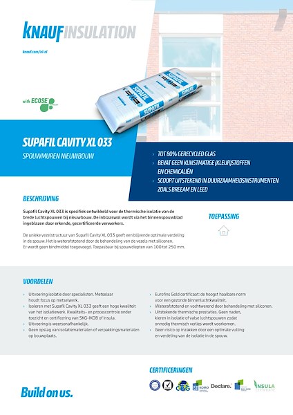 De SUPAFIL Cavity XL isolatie wol is ontwikkeld voor de thermische isolatie van de brede luchtspouw bij nieuwbouw. De inblaaswol wordt via het binnenspouwblad ingeblazen door erkende, gecertificeerde verwerkers.