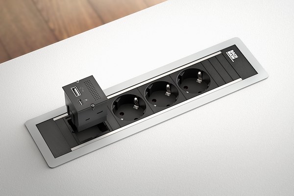 We besparen niet alleen op de kosten, maar ook in het materiaal. De behuizing blijft. Alleen de custom module wordt uitgewisseld. Dat gaat heel gemakkelijk. Met twee schroefjes is de oude module los te halen en met dezelfde twee schroefjes wordt de nieuwe module weer bevestigd. Daarna alleen nog maar de bekabelingveranderen en het tafelstopcontact is weer helemaal up-to-date!