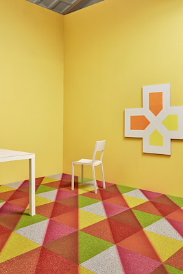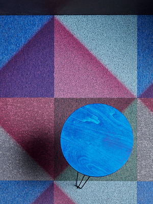 hebben speels en creatief nagedacht over hoe de levensduur van imperfecte DESSO-tapijttegels kan worden verlengd. Ze ontwikkelden een innovatieve verfmethode, waarbij de helft van de tegels opnieuw rood werd gekleurd.