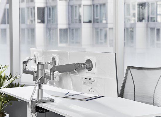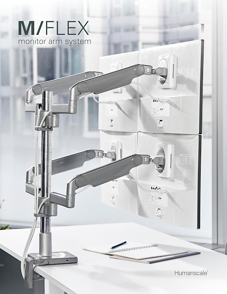Met het M/Flex multi-monitor armsysteem kan de gebruiker eenvoudig van configuratie wisselen om aan zijn veranderende wensen te voldoen, terwijl de strakke, minimale esthetiek behouden blijft. M/Flex is voornamelijk gemaakt van gerecycled aluminium en is dus even recyclebaar als mooi.