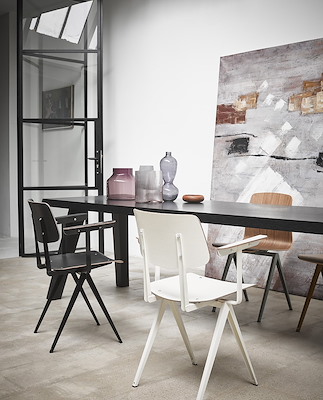 De stoel waar vroeger de leraar op zat; de S16 met arm. Voor dat extra beetje comfort is de S16 ook verkrijgbaar met armleuningen. De armleggers van pantserhout hebben dezelfde kleuren als de zitting en rugleuning en zijn net zo onverslijtbaar, waardoor de stoel jaren mee gaat. De S16 met arm en de ‘klassieke’ S16 zijn natuurlijk uitstekend met elkaar te combineren en staan garant voor een urban industrial touch aan elk interieur.