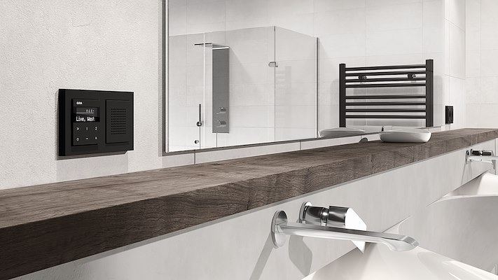 Door de installatie direct in de wand staat de Gira inbouwradio IP nergens in de weg. Hierdoor is er bijvoorbeeld meer ruimte in de keuken en liggen er geen onhandige kabels. Omdat het apparaat een 230V/AC-ingang neveneenheid heeft voor het in- en uitschakelen van de radio, kan een gemeenschappelijk in- en uitschakelen met de verlichting worden gerealiseerd – bijvoorbeeld in de badkamer. Deze oplossing is bijzonder comfortabel, als het licht automatisch via een bewegingsmelder wordt aangestuurd.