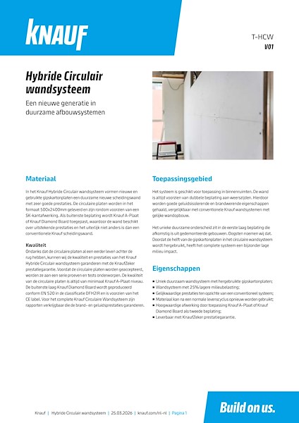 Het Knauf Hybride Circulair Wandsysteem is het eerste circulaire bouwsysteem van Knauf. Voor de ontwikkeling van dit wandsysteem worden elementen uit oude gebouwen gehaald en modulair toegepast in nieuwe gebouwen. Als een gebouw aan het eind van zijn levenscyclus is, is veel materiaal nog van hoge kwaliteit en bruikbaar. Het is zonde om te slopen en de waarde te vernietigen.