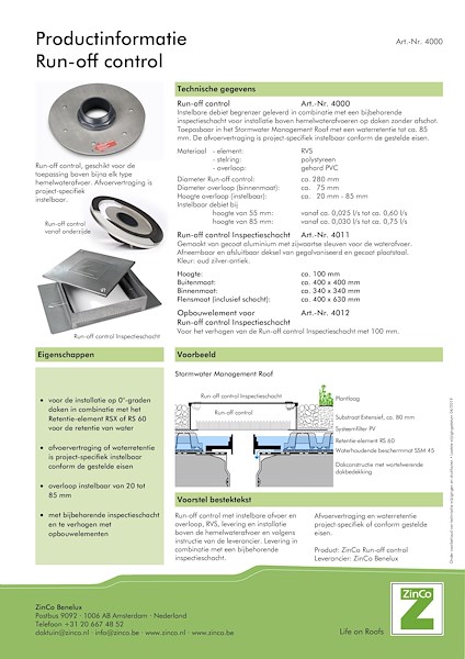 Run-off control, geschikt voor de toepassing boven bijna elk type hemelwaterafvoer. Afvoervertraging is project-specifiek instelbaar. De inspectieschacht is gemaakt van gecoat aluminium met zijwaartse sleuven voor de waterafvoer. Afneembaar en afsluitbaar deksel van gegalvaniseerd en gecoat plaatstaal. Kleur: oud zilver-antiek.